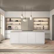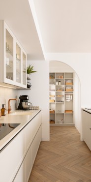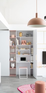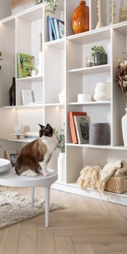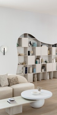 Le blanc enveloppe les espaces d’une lumière apaisante, tandis que les lignes courbes, les matières naturelles et les volumes maîtrisés créent une atmosphère chaleureuse et sereine. Bibliothèques aériennes, dressings intégrés et meubles multifonctions structurent l’espace sans jamais l’alourdir.