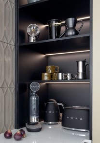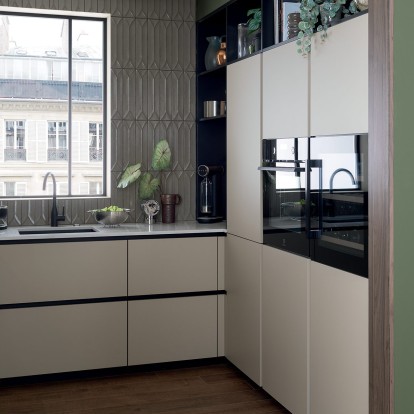 Cette ambiance d'inspiration Art déco, transforme l'espace de préparation en un véritable sanctuaire de bien-être. Les équipements du quotidien restent à portée de main tout en étant dissimulés, préservant un espace épuré et fonctionnel.