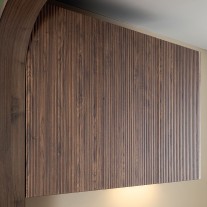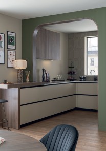 Façades Mélia ginger verni mat et Silona noyer rainuré, profils sans poignée laqués noir mat.