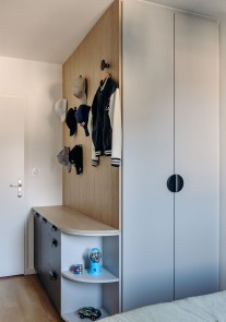 Près de la porte venant du couloir, un meuble petite largeur surmonté de patères apporte une touche design et pratique. Son plateau peut servir de console ou de table de dépose. L’armoire avec portes toute hauteur optimise le rangement avec son aménagement intérieur sur mesure adapté aux différentes tailles de vêtements.