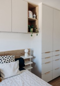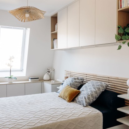 Un meuble bas petite largeur intègre, sous la fenêtre, du rangement, dont une étagère ouverte pour les livres. Un chevet au design original encadre le lit tandis qu’au-dessus des meubles hauts offrent des placards supplémentaires dans une belle unité avec les armoires du dressing adjacent.