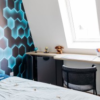 Dans la chambre enfant, le meuble s’adapte aux usages. Un bureau avec plateau et rangement prend place sous la fenêtre. Ses tiroirs et son étagère ouverte facilitent l’organisation.