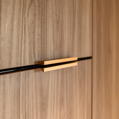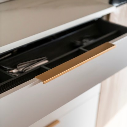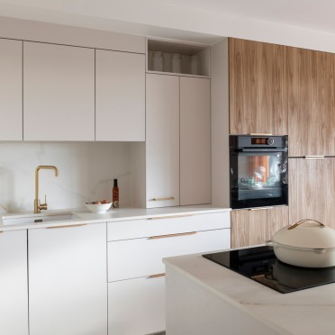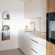 Dans les cuisines semi-ouvertes, les rangements sont essentiels pour préserver une impression d’ordre et de déco soignée. Ici, la conceptrice a fait le choix de meubles fonctionnels, soulignés d’une poignée en finition laiton qui rehausse le blanc et le bois des façades, apportant une allure élégante à cette pièce.