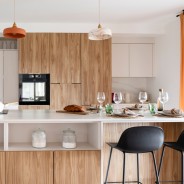 Oui ! Au cœur de cette cuisine semi-ouverte, le grand îlot central joue un rôle clé dans cette réalisation. Véritable atout au quotidien, il sert de rangement complémentaire, de plan de travail pour la préparation, et remplace aussi la salle à manger. En effet, d’un côté, il fait office de table pour les repas ou de snack convivial pour les apéros ou les petits déjeuners. De l’autre, intégrée dans le plan de travail, une plaque de cuisson permet de cuisiner tout en conservant une interaction permanente avec le living.