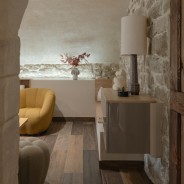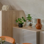 Aménager un salon sous pente est un projet passionnant, qui peut cependant sembler contraignant. Pourtant, avec de bonnes idées et des conseils avisés, un plafond sous les toits se transforme en un bel atout déco. Pour ce projet d’aménagement, la rénovation de l’ancienne cave voûtée accentue l’originalité de la maison. Dans l’entrée attenante au salon, l’ensemble de meubles personnalisés offre un vaste espace de rangement. Le passage entre les deux pièces est habillé d’un encadrement miroir apportant de la lumière. Il met particulièrement en valeur le caractère unique du plafond courbe, apportant un véritable cachet à cet intérieur.