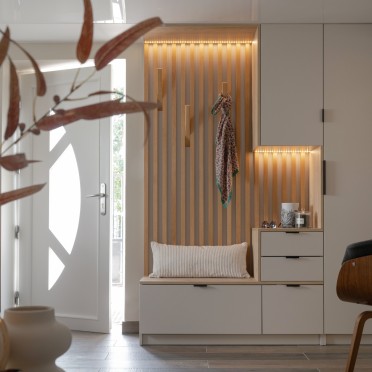 - un meuble, à l’entrée de la pièce, intégrant penderie et rangement pour les chaussures,